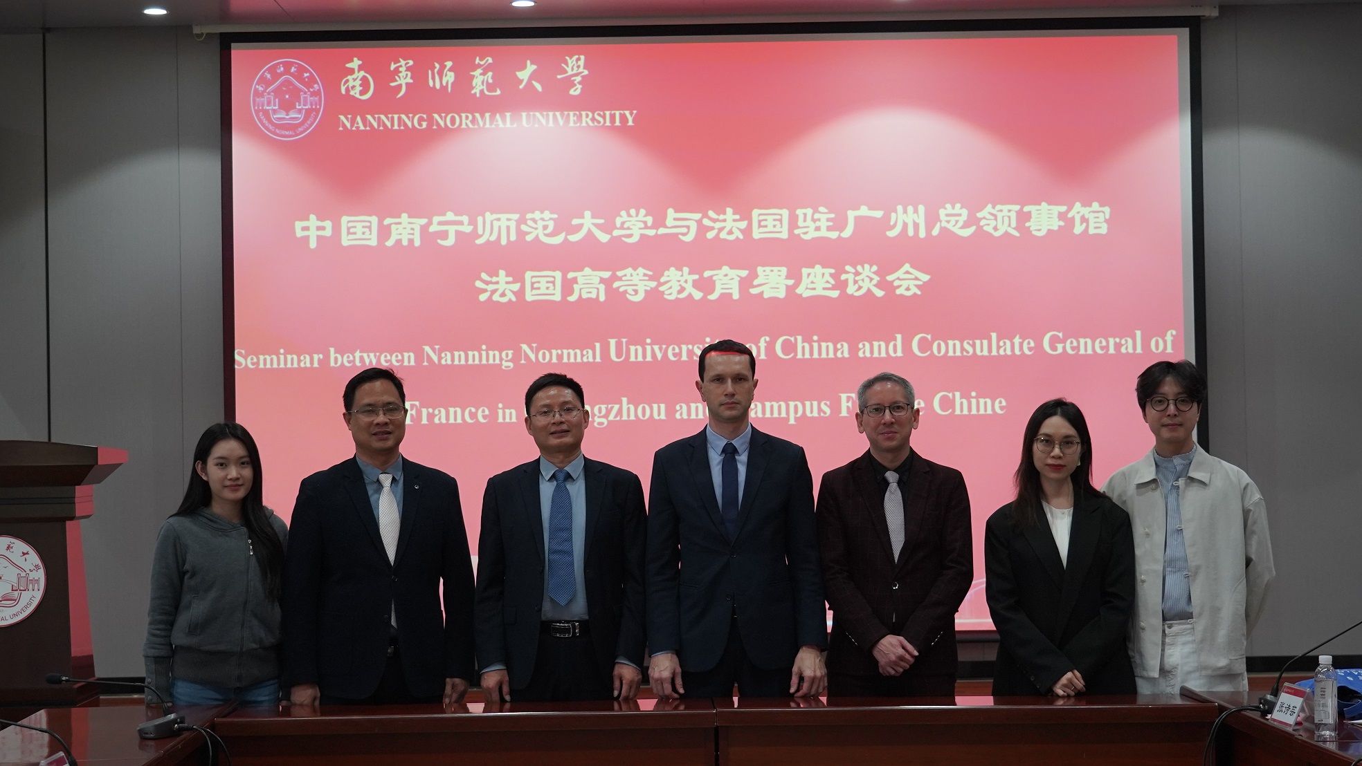 12月10日下午,法国驻广州总领事馆科技与高等教育合作领事敖礼威一行4人到我校访问,我校国际交流合作处处长/国际教育学院院长杨绪明及相关人员在武鸣校区行政楼北127会议室接待了领事一行,并召开座谈会。