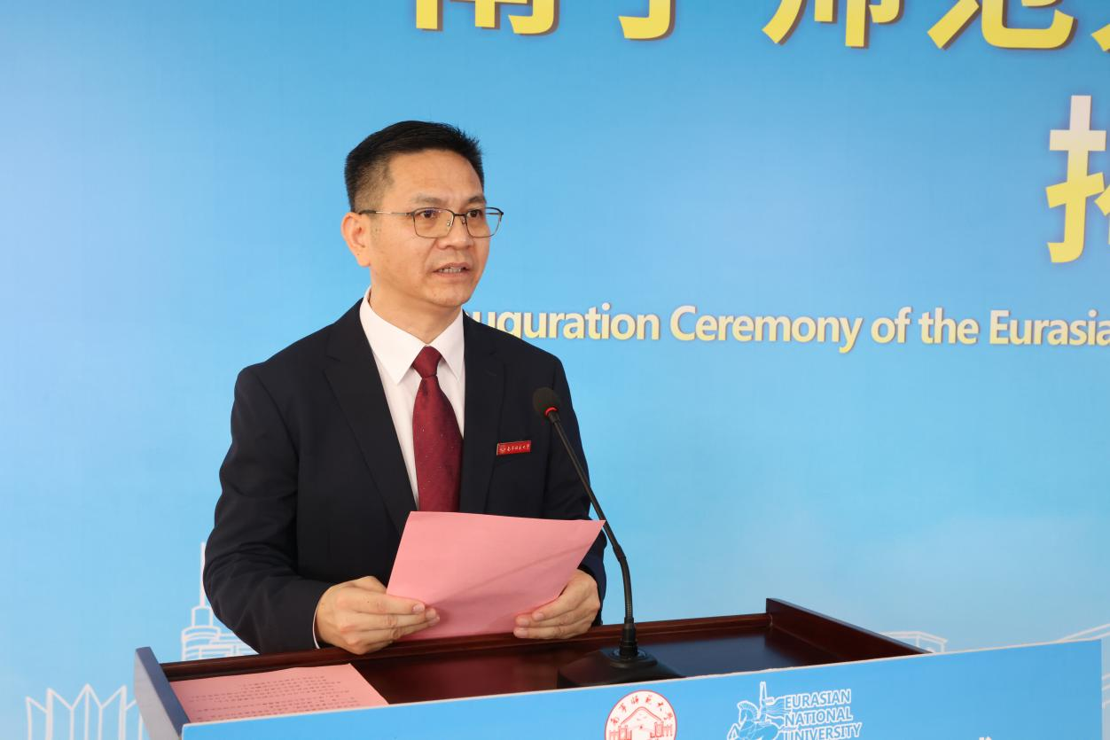 4月8日上午,南宁师范大学欧亚理工学院揭牌仪式在武鸣校区地海楼大厅举行。自治区教育厅对外合作处副处长黄毅菲,哈萨克斯坦欧亚国立大学校长西迪科夫・叶尔兰・巴塔舍维奇、副校长贝森拜・阿达克・巴赫托维奇,南宁师范大学党委书记张鹏、校长隆广庆、副校长龙妮娜出席仪式,两校相关单位负责人、师生代表共同见证这一重要时刻。仪式由隆广庆校长主持。