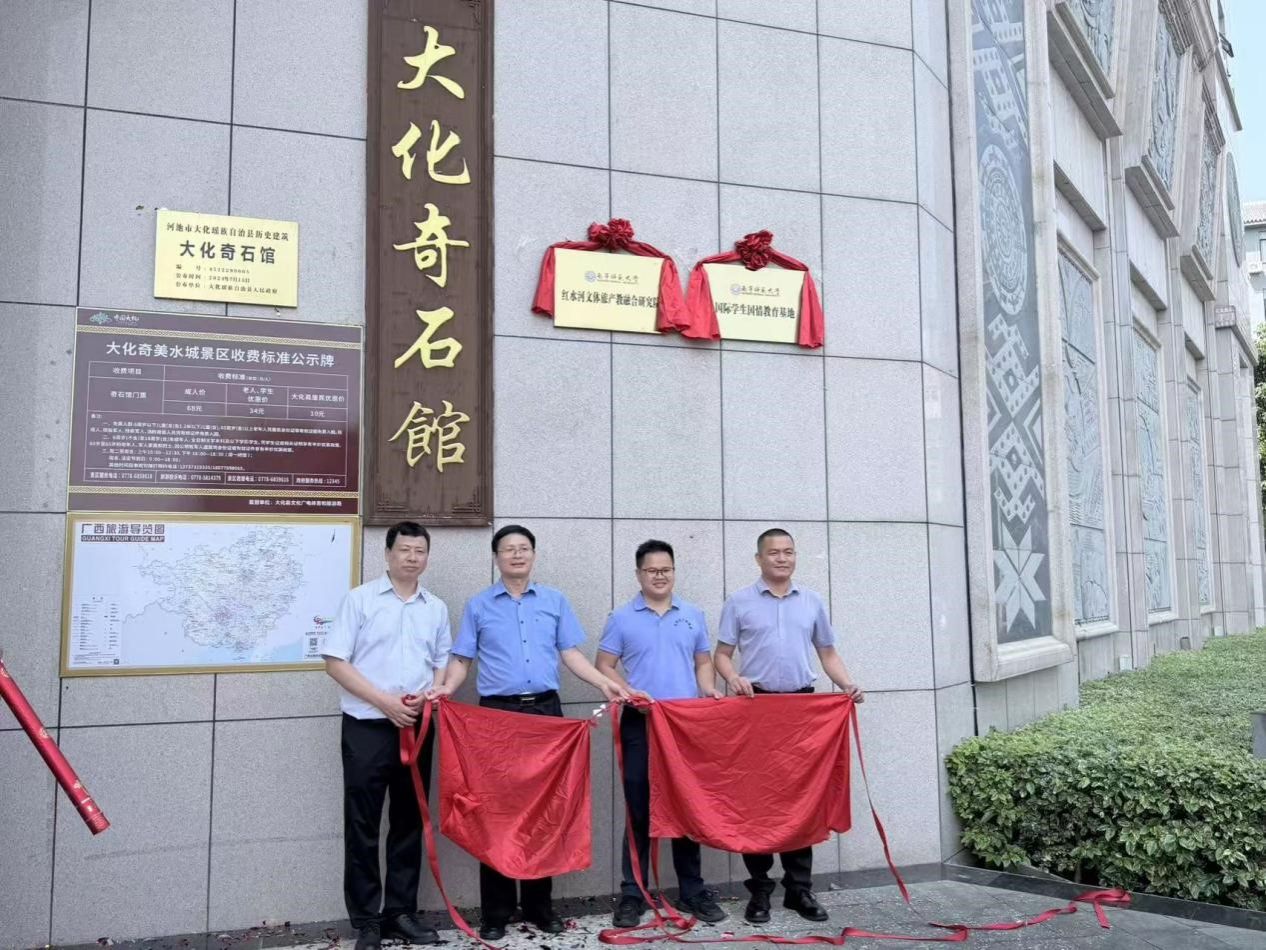 当日下午,我校国际交流合作处处长/国际教育学院院长杨绪明、旅游与文化学院院长段文军、大化瑶族自治县文化广电体育和旅游局副局长唐秀松、大化文旅投资集团有限公司董事/副总经理覃俊等领导和中外师生共同在大化奇石馆举行“国际学生国情教育基地”挂牌仪式。该基地的正式落户,标志着我校在探索国际学生国情教育方面迈出重要一步。杨院长表示,基地未来将为国际学生深入了解中国国情、感知民族文化和地方经济社会发展提供长期、稳定的实践平台。